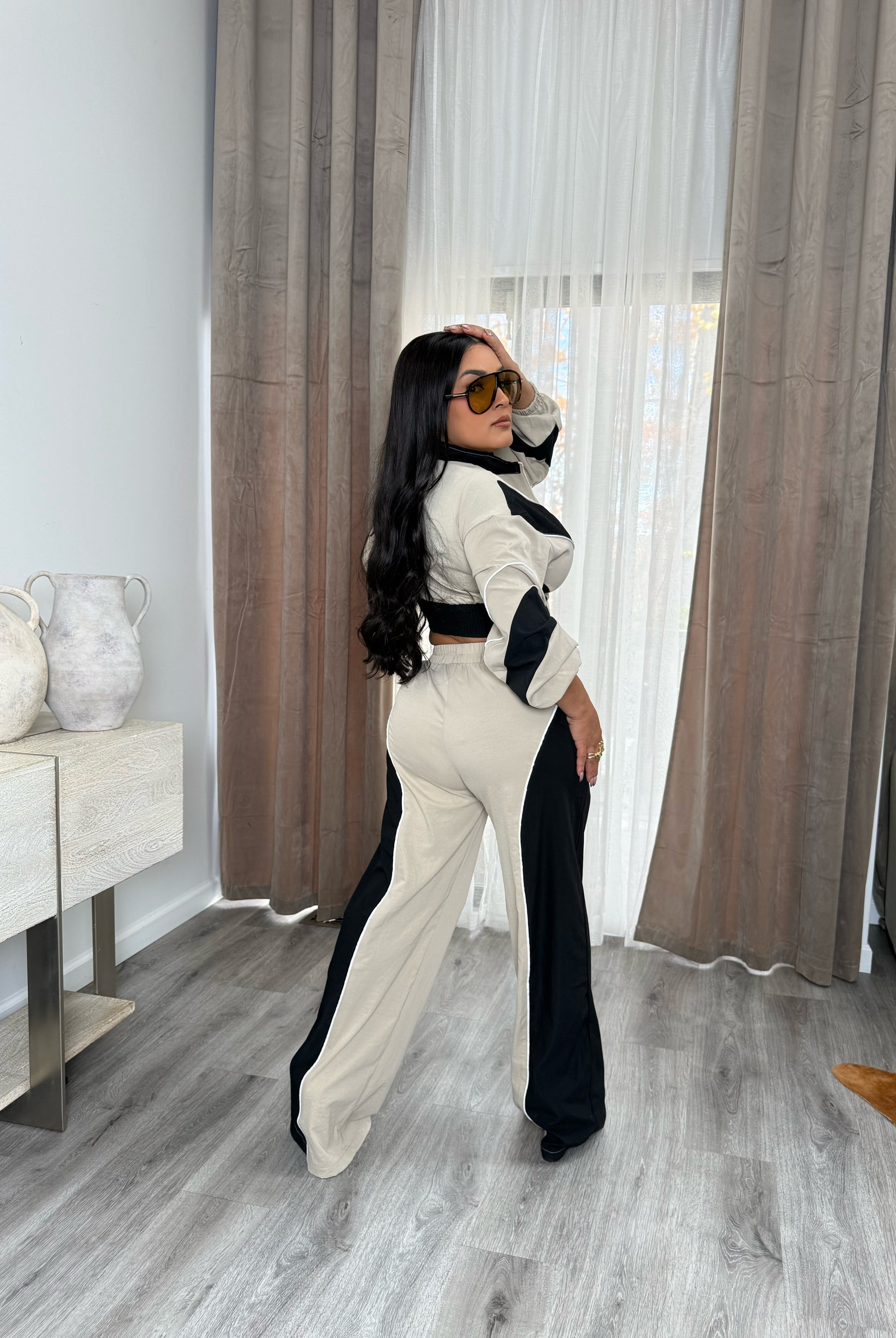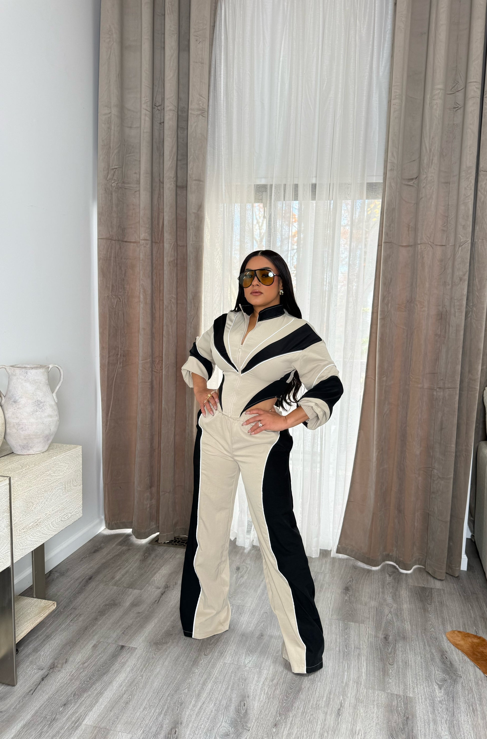 Conjunto completo con chaqueta de cierre frontal y pantalón a juego Diseño bicolor que estiliza la silueta Tela suave resistente y con ligera elasticidad Corte moderno que se adapta al cuerpo y alarga visualmente las piernas Perfecto para un outfit casual con un toque chic